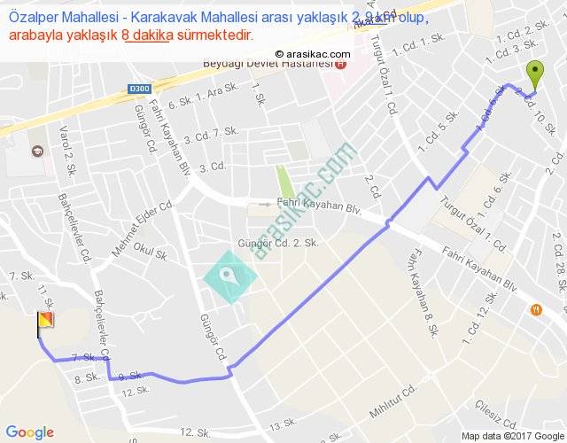 Özalper Mahallesi - Karakavak Mahallesi arası yaklaşık olarak 90 km/h ile yukarıda belirtilen sürede olup, iki yerin kuş uçuşu uzaklığı (mesafesi) 2'dir. Yolculuk otobüsle 10 dakika sürmektedir.
