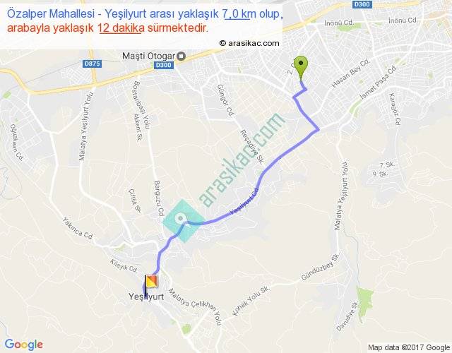 Özalper Mahallesi - Yeşilyurt arası yaklaşık olarak 90 km/h ile yukarıda belirtilen sürede olup, iki yerin kuş uçuşu uzaklığı (mesafesi) 6'dir. Yolculuk otobüsle 15 dakika sürmektedir.