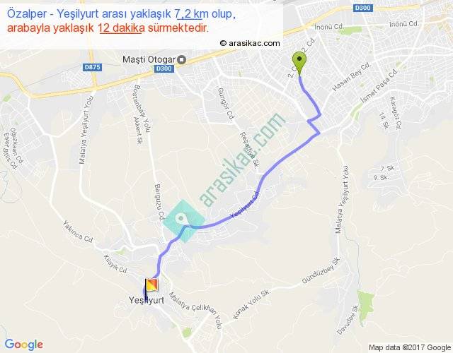 Özalper - Yeşilyurt arası yaklaşık olarak 90 km/h ile yukarıda belirtilen sürede olup, iki yerin kuş uçuşu uzaklığı (mesafesi) 6'dir. Yolculuk otobüsle 15 dakika sürmektedir.
