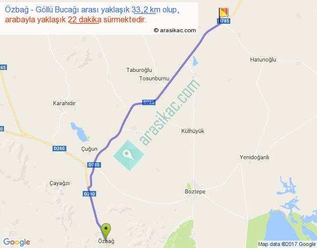 Özbağ - Göllü Bucağı arası yaklaşık olarak 90 km/h ile yukarıda belirtilen sürede olup, iki yerin kuş uçuşu uzaklığı (mesafesi) 29'dir. Yolculuk otobüsle 28 dakika sürmektedir.