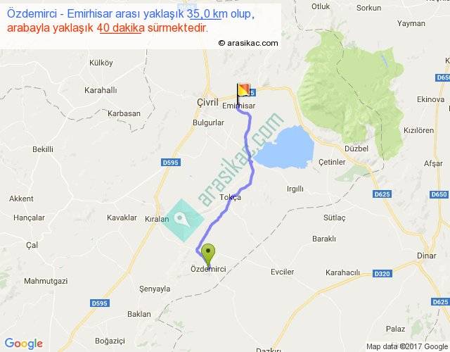 Özdemirci - Emirhisar arası yaklaşık olarak 90 km/h ile yukarıda belirtilen sürede olup, iki yerin kuş uçuşu uzaklığı (mesafesi) 28'dir. Yolculuk otobüsle 52 dakika sürmektedir.