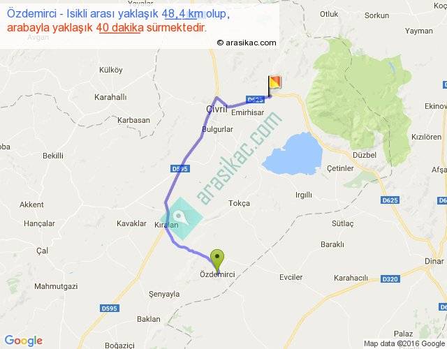 Özdemirci - Isikli arası yaklaşık olarak 90 km/h ile yukarıda belirtilen sürede olup, iki yerin kuş uçuşu uzaklığı (mesafesi) 32'dir. Yolculuk otobüsle 52 dakika sürmektedir.
