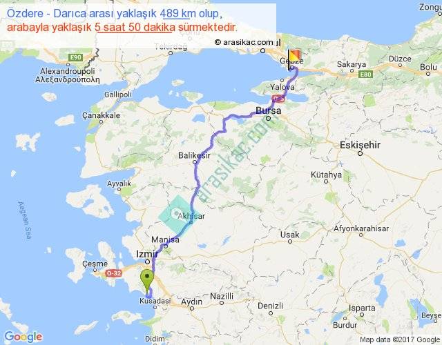 Özdere - Darıca arası yaklaşık olarak 90 km/h ile yukarıda belirtilen sürede olup, iki yerin kuş uçuşu uzaklığı (mesafesi) 361'dir. Eğer belirtilen yerler arasında uçak seferi var ise bu süre uçakla 33 dakika'ya kadar düşebilir. Yolculuk otobüsle 7 saat 35 dakika sürmektedir.