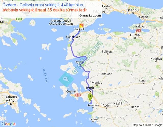 Özdere - Gelibolu arası yaklaşık olarak 90 km/h ile yukarıda belirtilen sürede olup, iki yerin kuş uçuşu uzaklığı (mesafesi) 267'dir. Eğer belirtilen yerler arasında uçak seferi var ise bu süre uçakla 24 dakika'ya kadar düşebilir. Yolculuk otobüsle 8 saat 33 dakika sürmektedir.