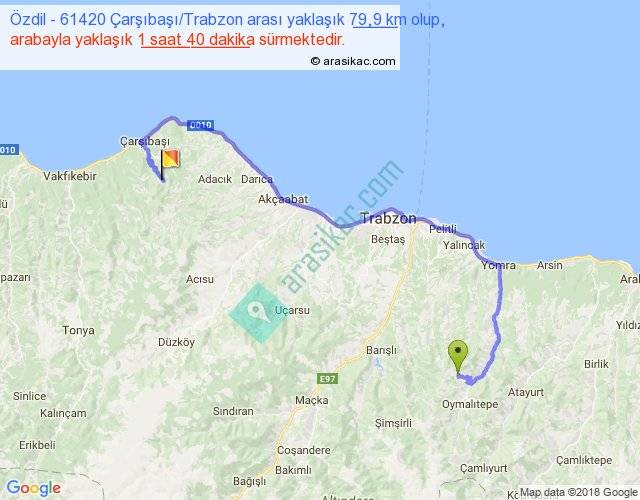 Özdil - 61420 Çarşıbaşı Trabzon arası yaklaşık olarak 90 km/h ile yukarıda belirtilen sürede olup, iki yerin kuş uçuşu uzaklığı (mesafesi) 41'dir. Yolculuk otobüsle 2 saat 10 dakika sürmektedir.