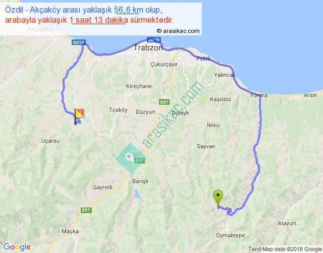 Özdil - Akçaköy arası yaklaşık olarak 90 km/h ile yukarıda belirtilen sürede olup, iki yerin kuş uçuşu uzaklığı (mesafesi) 19'dir. Yolculuk otobüsle 1 saat 34 dakika sürmektedir.