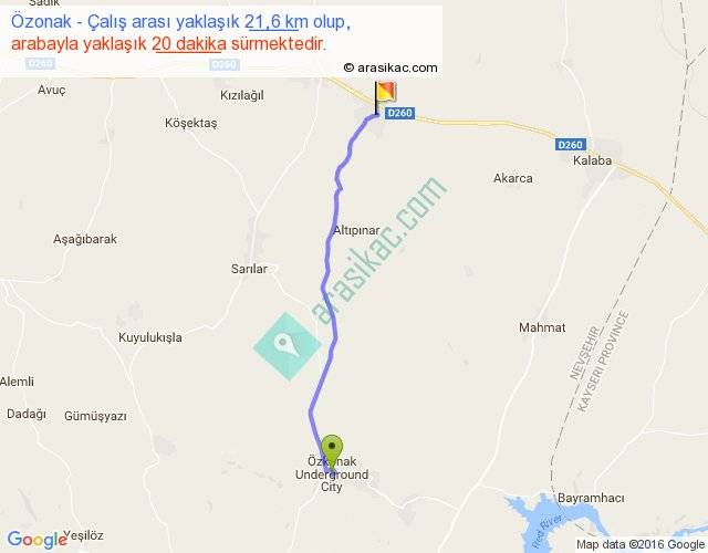 Özonak - Çalış arası yaklaşık olarak 90 km/h ile yukarıda belirtilen sürede olup, iki yerin kuş uçuşu uzaklığı (mesafesi) 19'dir. Yolculuk otobüsle 26 dakika sürmektedir.