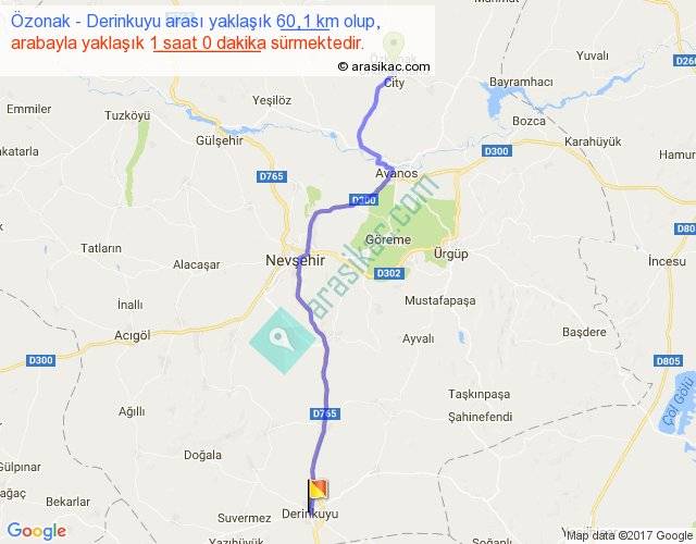 Özonak - Derinkuyu arası yaklaşık olarak 90 km/h ile yukarıda belirtilen sürede olup, iki yerin kuş uçuşu uzaklığı (mesafesi) 49'dir. Yolculuk otobüsle 1 saat 18 dakika sürmektedir.