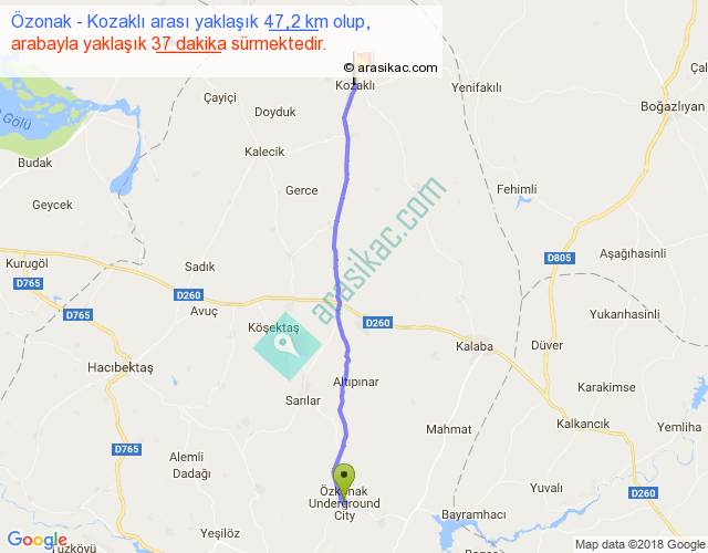 Özonak - Kozaklı arası yaklaşık olarak 90 km/h ile yukarıda belirtilen sürede olup, iki yerin kuş uçuşu uzaklığı (mesafesi) 45'dir. Yolculuk otobüsle 48 dakika sürmektedir.
