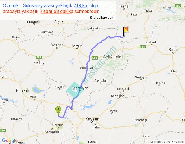 Özonak - Sulusaray arası yaklaşık olarak 90 km/h ile yukarıda belirtilen sürede olup, iki yerin kuş uçuşu uzaklığı (mesafesi) 169'dir. Yolculuk otobüsle 3 saat 51 dakika sürmektedir.