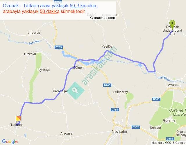 Özonak - Tatların arası yaklaşık olarak 90 km/h ile yukarıda belirtilen sürede olup, iki yerin kuş uçuşu uzaklığı (mesafesi) 37'dir. Yolculuk otobüsle 1 saat 5 dakika sürmektedir.