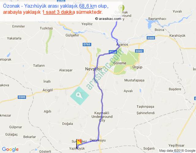 Özonak - Yazıhüyük arası yaklaşık olarak 90 km/h ile yukarıda belirtilen sürede olup, iki yerin kuş uçuşu uzaklığı (mesafesi) 54'dir. Yolculuk otobüsle 1 saat 21 dakika sürmektedir.