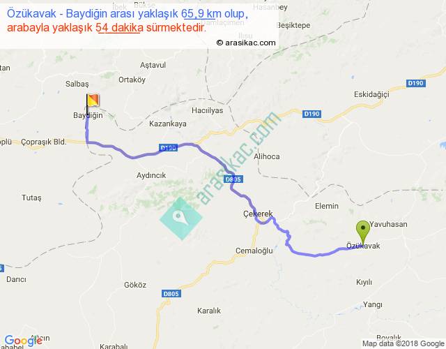 Özükavak - Baydiğin arası yaklaşık olarak 90 km/h ile yukarıda belirtilen sürede olup, iki yerin kuş uçuşu uzaklığı (mesafesi) 51'dir. Yolculuk otobüsle 1 saat 10 dakika sürmektedir.
