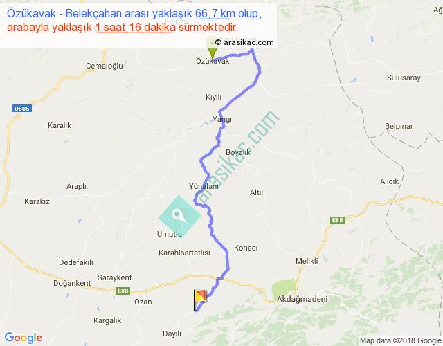 Özükavak - Belekçahan arası yaklaşık olarak 90 km/h ile yukarıda belirtilen sürede olup, iki yerin kuş uçuşu uzaklığı (mesafesi) 42'dir. Yolculuk otobüsle 1 saat 38 dakika sürmektedir.