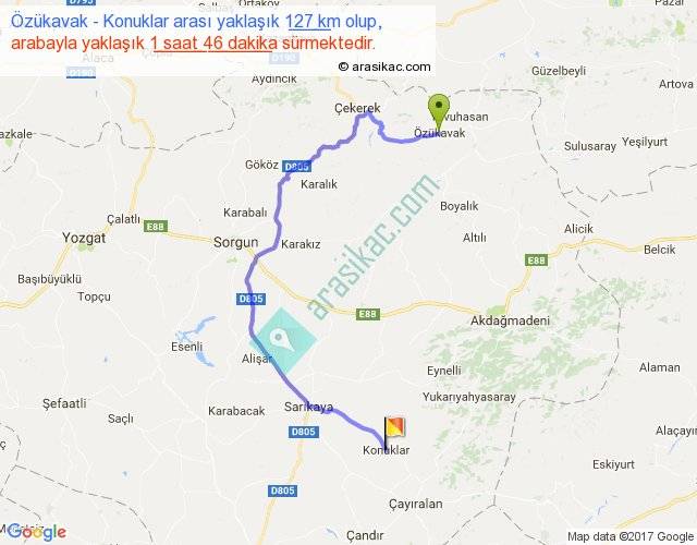 Özükavak - Konuklar arası yaklaşık olarak 90 km/h ile yukarıda belirtilen sürede olup, iki yerin kuş uçuşu uzaklığı (mesafesi) 69'dir. Yolculuk otobüsle 2 saat 17 dakika sürmektedir.