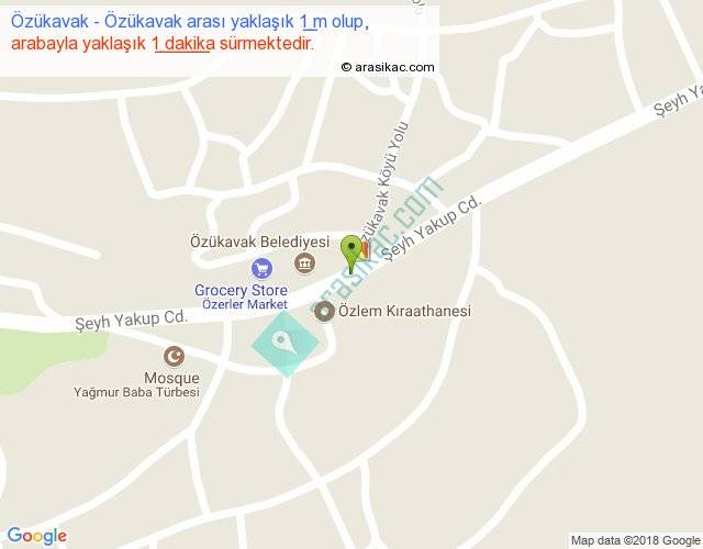 Özükavak - Özükavak arası yaklaşık olarak 90 km/h ile yukarıda belirtilen sürede olup, iki yerin kuş uçuşu uzaklığı (mesafesi) 0'dir. Yolculuk otobüsle 1 dakika sürmektedir.