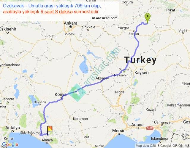 Özükavak - Umutlu arası yaklaşık olarak 90 km/h ile yukarıda belirtilen sürede olup, iki yerin kuş uçuşu uzaklığı (mesafesi) 481'dir. Eğer belirtilen yerler arasında uçak seferi var ise bu süre uçakla 44 dakika'ya kadar düşebilir. Yolculuk otobüsle 11 saat 52 dakika sürmektedir.