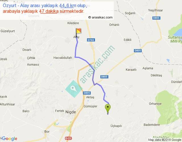 Özyurt - Alay arası yaklaşık olarak 90 km/h ile yukarıda belirtilen sürede olup, iki yerin kuş uçuşu uzaklığı (mesafesi) 35'dir. Yolculuk otobüsle 1 saat 1 dakika sürmektedir.
