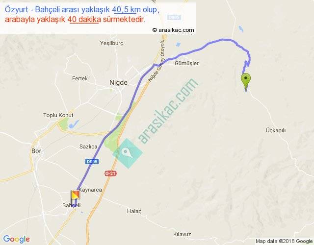 Özyurt - Bahçeli arası yaklaşık olarak 90 km/h ile yukarıda belirtilen sürede olup, iki yerin kuş uçuşu uzaklığı (mesafesi) 26'dir. Yolculuk otobüsle 52 dakika sürmektedir.
