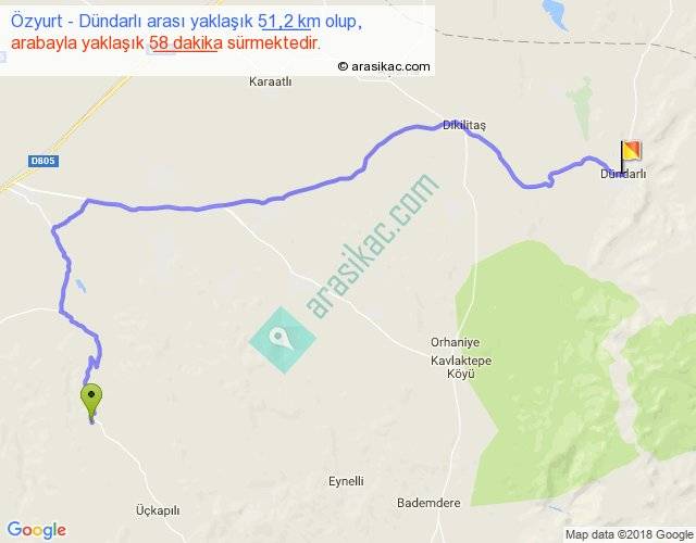 Özyurt - Dündarlı arası yaklaşık olarak 90 km/h ile yukarıda belirtilen sürede olup, iki yerin kuş uçuşu uzaklığı (mesafesi) 32'dir. Yolculuk otobüsle 1 saat 15 dakika sürmektedir.