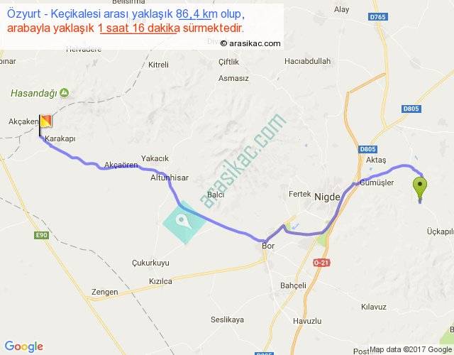 Özyurt - Keçikalesi arası yaklaşık olarak 90 km/h ile yukarıda belirtilen sürede olup, iki yerin kuş uçuşu uzaklığı (mesafesi) 65'dir. Yolculuk otobüsle 1 saat 38 dakika sürmektedir.