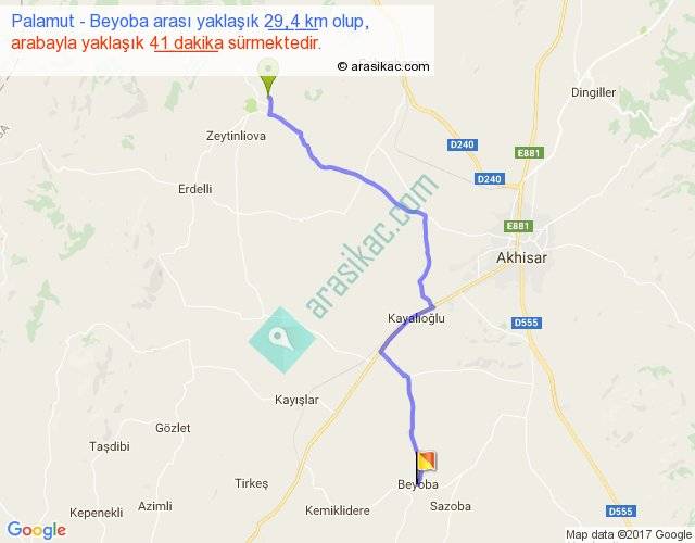 Palamut - Beyoba arası yaklaşık olarak 90 km/h ile yukarıda belirtilen sürede olup, iki yerin kuş uçuşu uzaklığı (mesafesi) 23'dir. Yolculuk otobüsle 53 dakika sürmektedir.