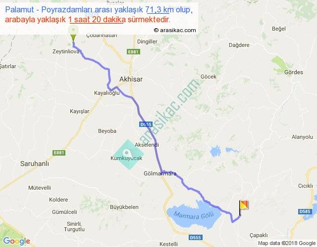Palamut - Poyrazdamları arası yaklaşık olarak 90 km/h ile yukarıda belirtilen sürede olup, iki yerin kuş uçuşu uzaklığı (mesafesi) 57'dir. Yolculuk otobüsle 1 saat 44 dakika sürmektedir.