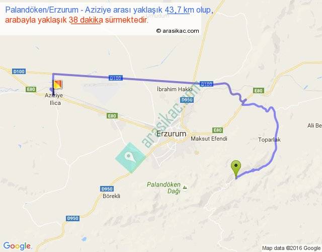 Palandöken Erzurum - Aziziye arası yaklaşık olarak 90 km/h ile yukarıda belirtilen sürede olup, iki yerin kuş uçuşu uzaklığı (mesafesi) 23'dir. Yolculuk otobüsle 49 dakika sürmektedir.