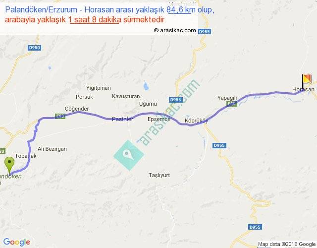Palandöken Erzurum - Horasan arası yaklaşık olarak 90 km/h ile yukarıda belirtilen sürede olup, iki yerin kuş uçuşu uzaklığı (mesafesi) 72'dir. Yolculuk otobüsle 1 saat 28 dakika sürmektedir.