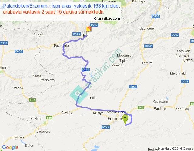 Palandöken Erzurum - İspir arası yaklaşık olarak 90 km/h ile yukarıda belirtilen sürede olup, iki yerin kuş uçuşu uzaklığı (mesafesi) 75'dir. Yolculuk otobüsle 2 saat 55 dakika sürmektedir.