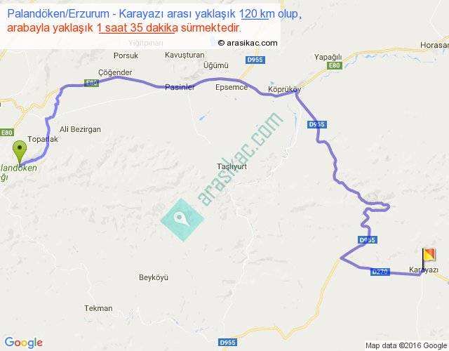 Palandöken Erzurum - Karayazı arası yaklaşık olarak 90 km/h ile yukarıda belirtilen sürede olup, iki yerin kuş uçuşu uzaklığı (mesafesi) 69'dir. Yolculuk otobüsle 2 saat 3 dakika sürmektedir.