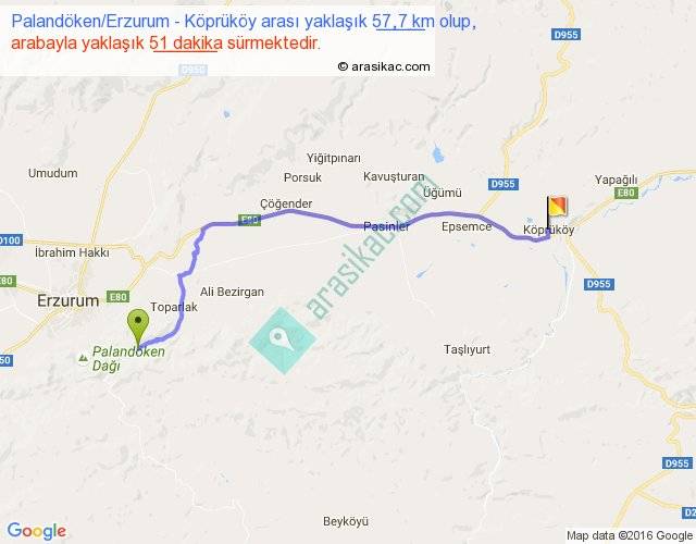 Palandöken Erzurum - Köprüköy arası yaklaşık olarak 90 km/h ile yukarıda belirtilen sürede olup, iki yerin kuş uçuşu uzaklığı (mesafesi) 46'dir. Yolculuk otobüsle 1 saat 6 dakika sürmektedir.