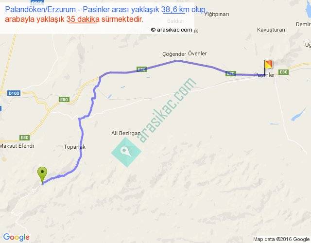 Palandöken Erzurum - Pasinler arası yaklaşık olarak 90 km/h ile yukarıda belirtilen sürede olup, iki yerin kuş uçuşu uzaklığı (mesafesi) 30'dir. Yolculuk otobüsle 45 dakika sürmektedir.
