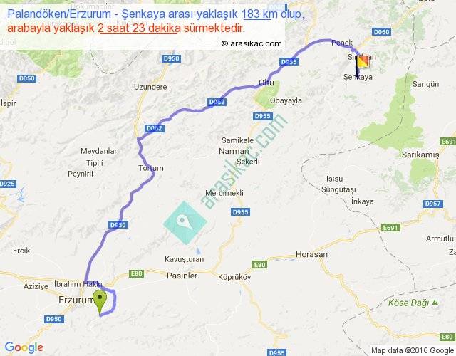 Palandöken Erzurum - Şenkaya arası yaklaşık olarak 90 km/h ile yukarıda belirtilen sürede olup, iki yerin kuş uçuşu uzaklığı (mesafesi) 114'dir. Yolculuk otobüsle 3 saat 5 dakika sürmektedir.