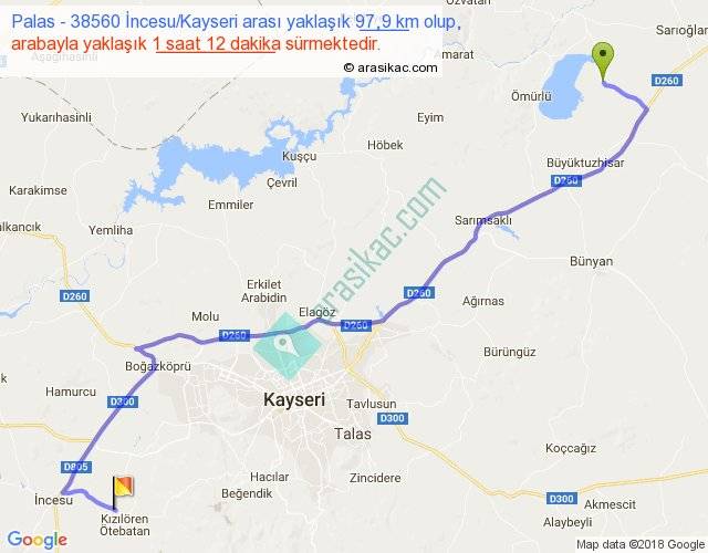 Palas - 38560 İncesu Kayseri arası yaklaşık olarak 90 km/h ile yukarıda belirtilen sürede olup, iki yerin kuş uçuşu uzaklığı (mesafesi) 69'dir. Yolculuk otobüsle 1 saat 33 dakika sürmektedir.