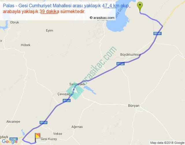 Palas - Gesi Cumhuriyet Mahallesi arası yaklaşık olarak 90 km/h ile yukarıda belirtilen sürede olup, iki yerin kuş uçuşu uzaklığı (mesafesi) 34'dir. Yolculuk otobüsle 50 dakika sürmektedir.