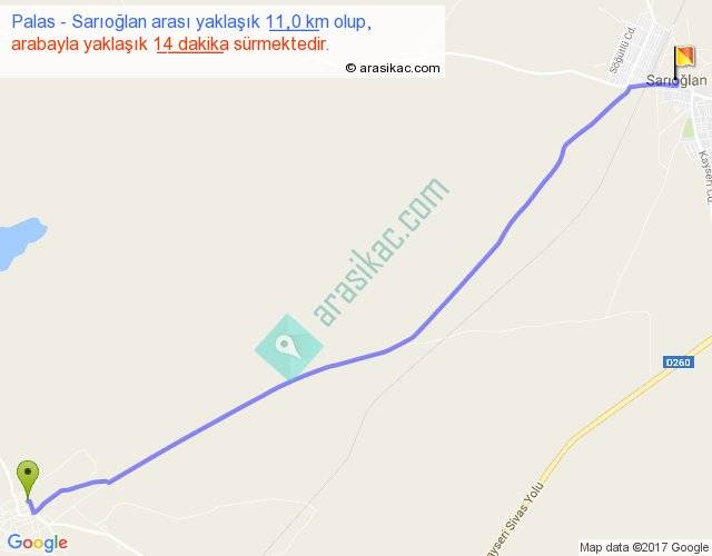 Palas - Sarıoğlan arası yaklaşık olarak 90 km/h ile yukarıda belirtilen sürede olup, iki yerin kuş uçuşu uzaklığı (mesafesi) 10'dir. Yolculuk otobüsle 18 dakika sürmektedir.