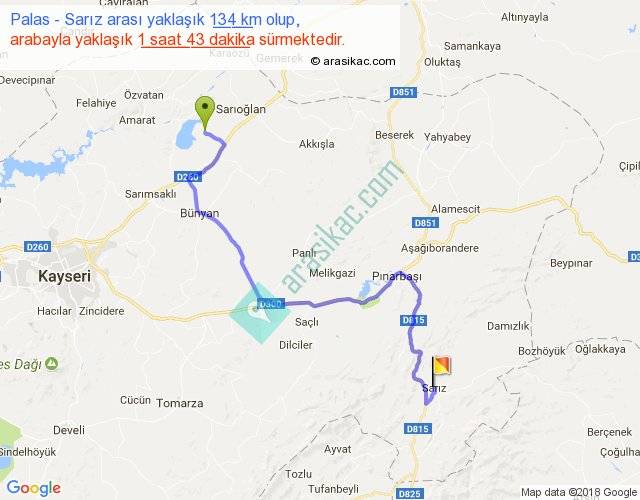 Palas - Sarız arası yaklaşık olarak 90 km/h ile yukarıda belirtilen sürede olup, iki yerin kuş uçuşu uzaklığı (mesafesi) 81'dir. Yolculuk otobüsle 2 saat 13 dakika sürmektedir.