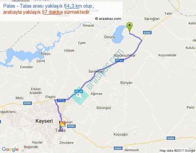 Palas - Talas arası yaklaşık olarak 90 km/h ile yukarıda belirtilen sürede olup, iki yerin kuş uçuşu uzaklığı (mesafesi) 46'dir. Yolculuk otobüsle 1 saat 14 dakika sürmektedir.