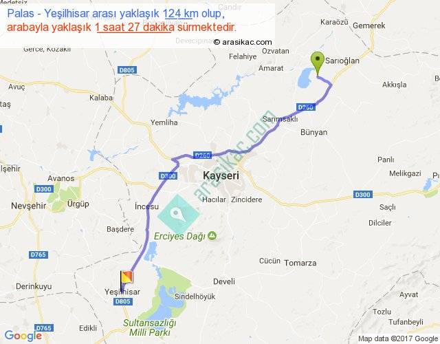 Palas - Yeşilhisar arası yaklaşık olarak 90 km/h ile yukarıda belirtilen sürede olup, iki yerin kuş uçuşu uzaklığı (mesafesi) 100'dir. Yolculuk otobüsle 1 saat 53 dakika sürmektedir.