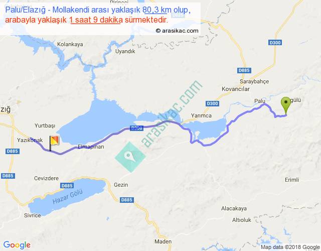 Palu Elazığ - Mollakendi arası yaklaşık olarak 90 km/h ile yukarıda belirtilen sürede olup, iki yerin kuş uçuşu uzaklığı (mesafesi) 56'dir. Yolculuk otobüsle 1 saat 29 dakika sürmektedir.