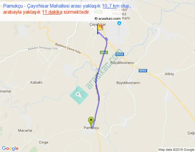 Pamukçu - Çayırhisar Mahallesi arası yaklaşık olarak 90 km/h ile yukarıda belirtilen sürede olup, iki yerin kuş uçuşu uzaklığı (mesafesi) 9'dir. Yolculuk otobüsle 14 dakika sürmektedir.