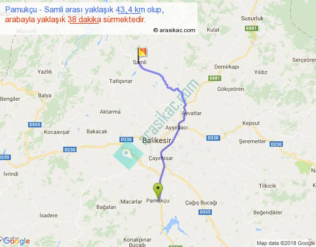 Pamukçu - Samli arası yaklaşık olarak 90 km/h ile yukarıda belirtilen sürede olup, iki yerin kuş uçuşu uzaklığı (mesafesi) 33'dir. Yolculuk otobüsle 49 dakika sürmektedir.