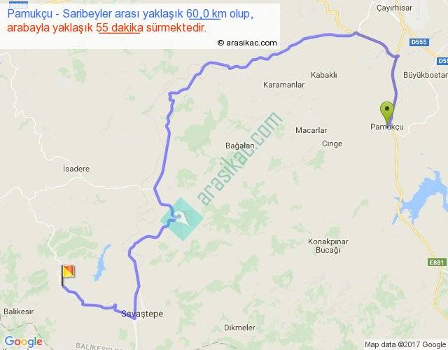 Pamukçu - Saribeyler arası yaklaşık olarak 90 km/h ile yukarıda belirtilen sürede olup, iki yerin kuş uçuşu uzaklığı (mesafesi) 30'dir. Yolculuk otobüsle 1 saat 11 dakika sürmektedir.