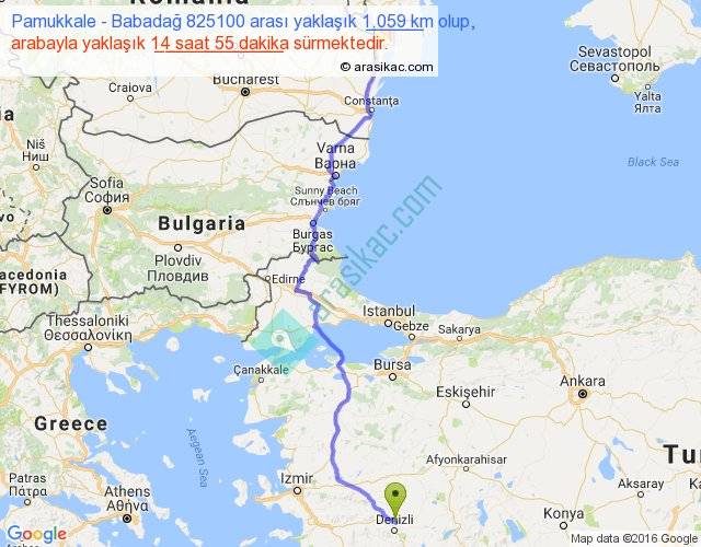 Pamukkale - Babadağ 825100 arası yaklaşık olarak 90 km/h ile yukarıda belirtilen sürede olup, iki yerin kuş uçuşu uzaklığı (mesafesi) 771'dir. Eğer belirtilen yerler arasında uçak seferi var ise bu süre uçakla 1 saat 11 dakika'ya kadar düşebilir. Yolculuk otobüsle 19 saat 23 dakika sürmektedir.