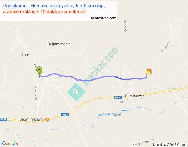 Pamukören - Horsunlu arası yaklaşık olarak 90 km/h ile yukarıda belirtilen sürede olup, iki yerin kuş uçuşu uzaklığı (mesafesi) 5'dir. Yolculuk otobüsle 20 dakika sürmektedir.