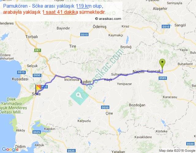 Pamukören - Söke arası yaklaşık olarak 90 km/h ile yukarıda belirtilen sürede olup, iki yerin kuş uçuşu uzaklığı (mesafesi) 101'dir. Yolculuk otobüsle 2 saat 11 dakika sürmektedir.