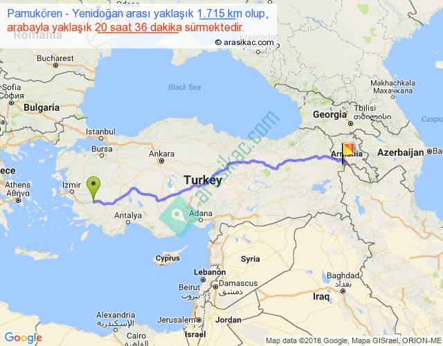 Pamukören - Yenidoğan arası yaklaşık olarak 90 km/h ile yukarıda belirtilen sürede olup, iki yerin kuş uçuşu uzaklığı (mesafesi) 1377'dir. Eğer belirtilen yerler arasında uçak seferi var ise bu süre uçakla 2 saat 07 dakika'ya kadar düşebilir. Yolculuk otobüsle 1 gün 2 saat sürmektedir.