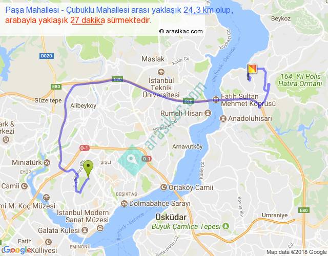 Paşa Mahallesi - Çubuklu Mahallesi arası yaklaşık olarak 90 km/h ile yukarıda belirtilen sürede olup, iki yerin kuş uçuşu uzaklığı (mesafesi) 11'dir. Yolculuk otobüsle 35 dakika sürmektedir.