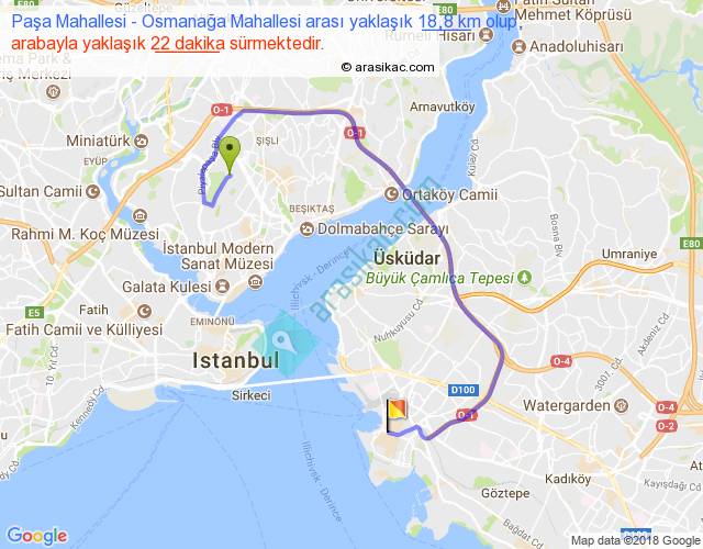 Paşa Mahallesi - Osmanağa Mahallesi arası yaklaşık olarak 90 km/h ile yukarıda belirtilen sürede olup, iki yerin kuş uçuşu uzaklığı (mesafesi) 8'dir. Yolculuk otobüsle 28 dakika sürmektedir.